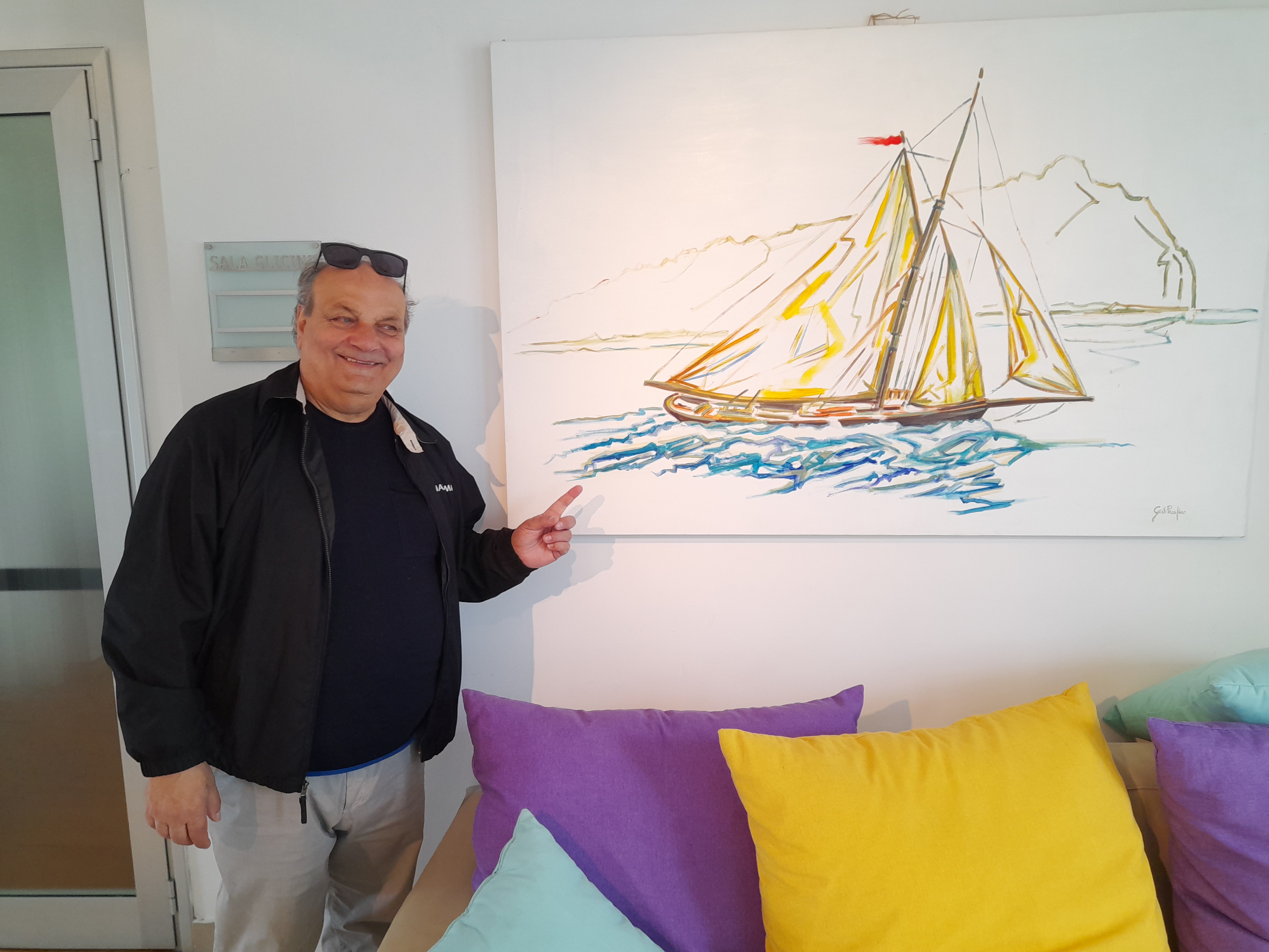 Gli spunti sono miei e li prendo dalle mie sensazioni, perché alcune cose non esistono su una foto o un soggetto. Questi tagli e queste colorazioni li creo io, come ad esempio una vela fatta in un certo modo. La barca è la metafora della vita e tutto il contesto sono le varie cose che ci possono accadere. Noi se vogliamo arrivare al nostro obiettivo, dobbiamo mantenere la barra dritta che sicuramente ci consentirà di realizzare i nostri sogni. Io penso che il mio messaggio sia positivo e può essere avvertito da tanti perché una barca che non affonda è una barca che regge qualsiasi tipo di perturbazione, regge l’urto ed è un invito ad essere sempre positivi. Nel mio quadro “sopra tutti” cerco di uscire fuori dalla problematica che ci può accadere in qualsiasi momento della vita. Uscire fuori significa reggere l’urto e di conseguenza ritrovarsi nella parte alta per sortire dalle difficoltà..