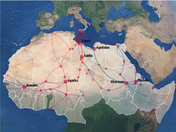 Ognuna di queste rotte attraversa il deserto del Sahara e passa o nella cittadina di Agadez, in Niger, per chi parte dal Sahel occidentale o per Khartoum, la capitale del Sudan, per chi parte dal Sahel orientale.