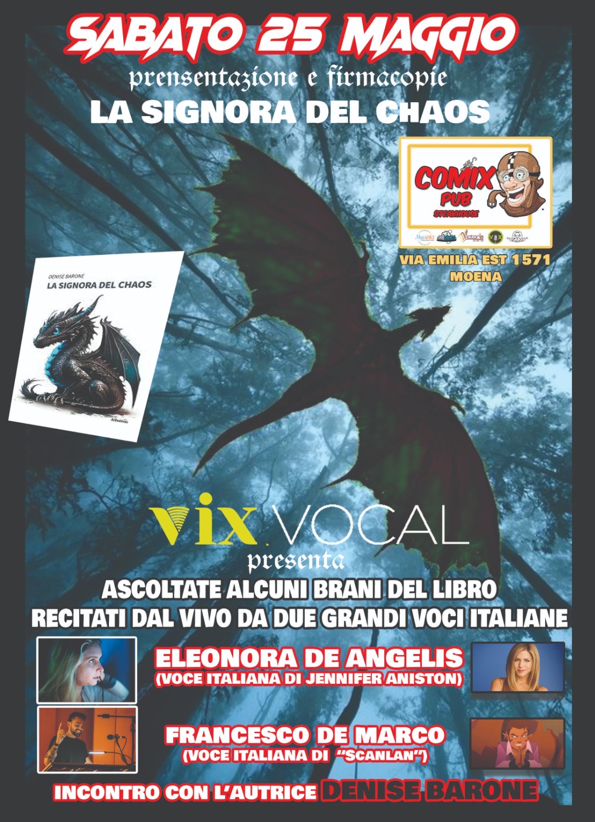 Nella serata del 25 maggio 2024, al COMIX PUB, un luogo interamente dedicato ai fumetti, agli anime, dove poter “nerdare” meravigliosamente e stare piacevolmente in compagnia poiché organizzatore di eventi a tema, in via Emilia Est n. 1571 a Modena, verrà presentato, ufficialmente per la prima volta nel modenese, il primo romanzo della saga fantasy firmata Denise Barone, denominato “LA SIGNORA DEL CHAOS“, Albatros-il Filo edizioni.