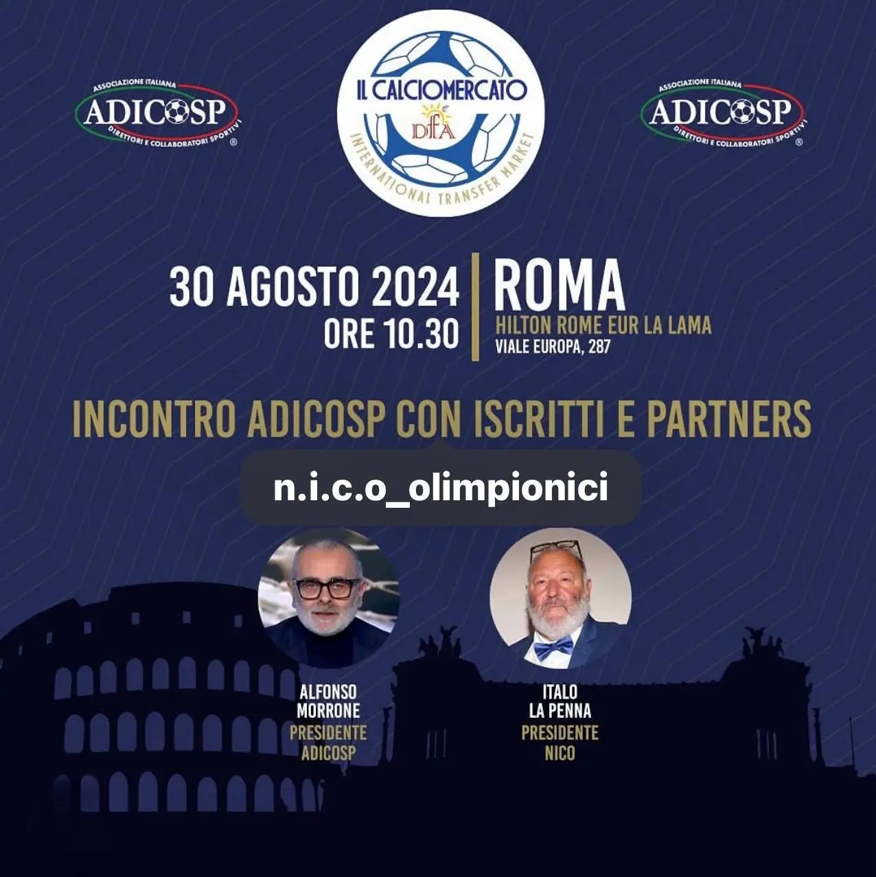 Lo scorso 29/30 Agosto presso Hotel Hilton Lama di Roma, in occasione della chiusura del calciomercato Estivo per la stagione 2024/2025, la N.I.C.O., Nazionale Italiana Calcio Olimpionici e Campioni dello Sport, ed il suo presidente Italo Lapenna sono stati invitati, come da tradizione, all’evento organizzato