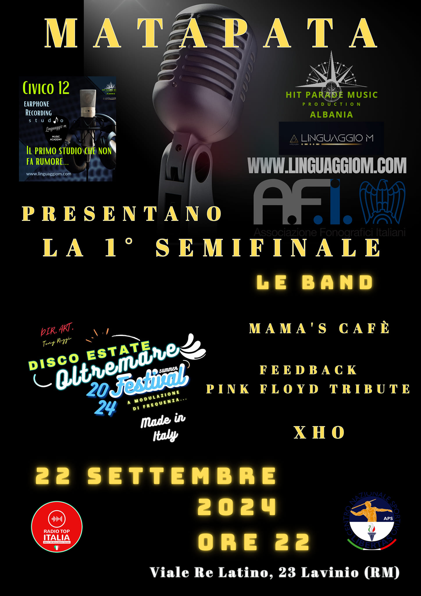 Sabato 21 settembre scorso presso il locale MATAPATA di Lavinio si è svolta la1^ semifinale 2024 del Disco Estate Oltremare 2023-2024 il Festival per Band. Linguaggio M Edizioni, Hit Parade Production. Nella serata erano presenti i seguenti gruppi: 1)I Mama’s Cafè 2)The feedback cafè e 3) The XHO. Nell’ambito dell’evento, ho ascoltato le opinioni di alcuni protagonisti della serata.