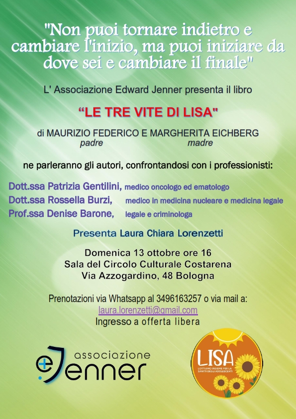 Domenica 13 ottobre si è svolta in pieno centro a Bologna, la presentazione dell’emozionante libro: “LE TRE VITE DI LISA“, patrocinata dalla nota Associazione no profit e pro veritate Edward Jenner.