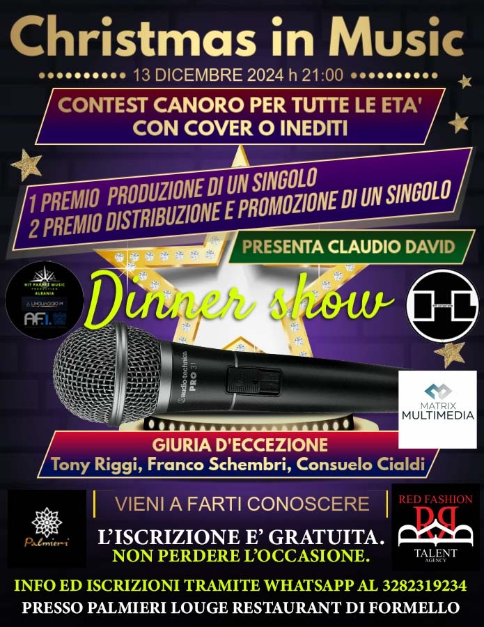 Venerdì scorso 13 dicembre 2024 presso il Ristorante di Formello, Palmieri Louge si è svolto “Christmas in Music” il Contest Canoro per tutte le età di Cover o inediti. C’erano personaggi di grande valore in giuria tra i quali Tony Riggi, Franco Schembri e Consuelo Cialdi. E’ stata una gradevole serata di Spettacolo, dove gli interpreti che si sono sfidati, hanno mostrato specifiche qualità artistiche e la loro indubbia passione per la musica.