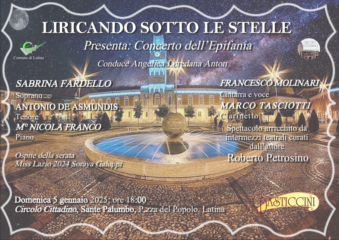 Domenica 5 gennaio, alle ore 18:00 nella prestigiosa sala del Circolo Cittadino “Sante Palumbo”, in Piazza del Popolo a Latina, si terrà il tradizionale concerto “LIRICANDO SOTTO LE STELLE “, uno spettacolo che promette emozioni uniche, grazie alla presenza di straordinari artisti. La Direttrice dell’evento, oltre che artista soprano Sabrina Fardello, ha rilasciato le seguenti dichiarazioni:
