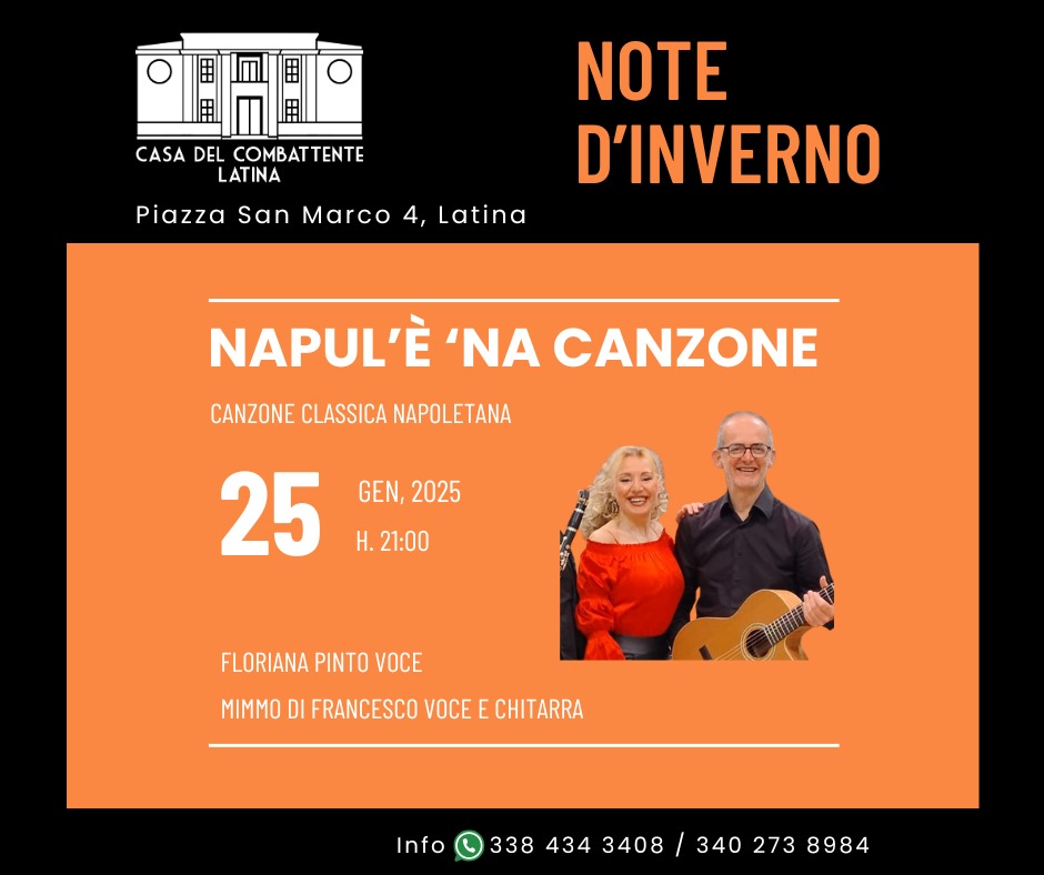 I bravissimi artisti partenopei Floriana Pinto (voce) e Mimmo Di Francesco (Voce e chitarra) sono lieti di presentare lo spettacolo “Napul’è na canzone” (un mix di canzoni classiche napoletane), che si terrà il prossimo 25 gennaio presso la casa del Combattente, in Piazza San Marco 3 a Latina.