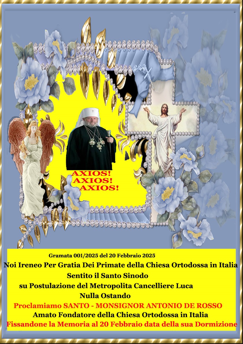 Il giorno 9 febbraio 2025, il Santo Sinodo della Chiesa Ortodossa in Italia, presieduto da sua Beatitudine Mons Ireneo, presso il convento dei Padri Saveriani in Salerno, sentite le motivazioni del postulatore per le cause dei santi, Mons Luca Monti, il Santo Sinodo approva e proclama Santo Sua Beatitudine Mons Antonio De Rosso, vescovo e fondatore della Chiesa Ortodossa in Italia e ne stabilisce la solennità il giorno 20 febbraio, data della nascita al cielo di Sua Beatitudine Mons Antonio De Rosso.