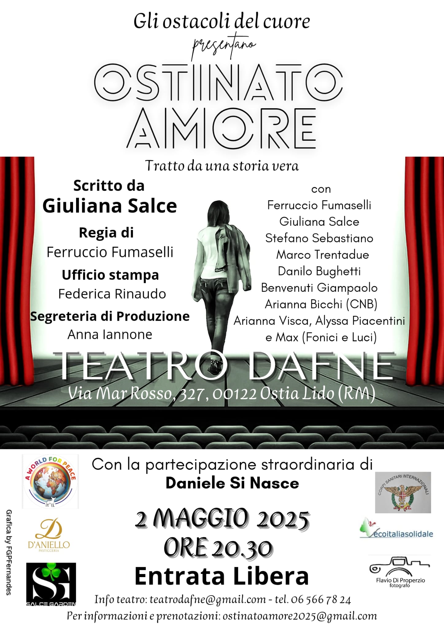 II giorno 2 maggio 2025 alle ore 2030 presso il teatro Dafne, sito in Ostia Lido in Via del Mar Rosso 327 verrà rappresentato lo spettacolo scritto da Giuliana Salce tratto dalla sua storia vera, con la regia di Ferruccio Fumaselli da un progetto dell’Associazione ONLUS gli ostacoli del cuore dal titolo “Ostinato Amore”. Lo spettacolo racconta l’ impressionante disagio nella coppia di oggi nel rapportare un dolore segreto, la mancanza di divulgazione tra uomo e donna logora qualsiasi rapporto creando infelicità e disagio nelle quattro mura domestiche.