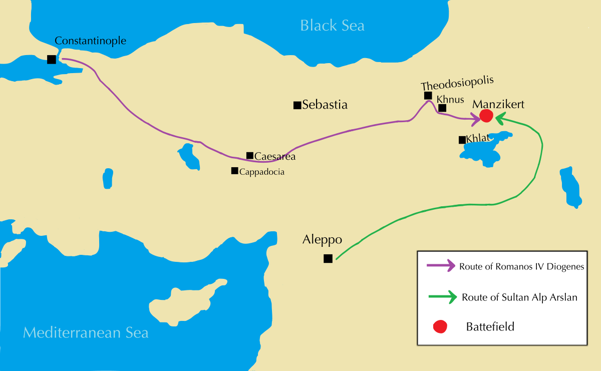 Romano IV Diogene, salito al trono con l’obiettivo di rafforzare l’Impero e respingere i turchi, organizzò una grande campagna militare volta a riconquistare le posizioni perdute e a fermare l’avanzata selgiuchide. Con un esercito composto da truppe regolari bizantine, mercenari stranieri e contingenti di nobili, marciò verso l’est, incontrando le forze di Alp Arslan nei pressi di Manzikert.