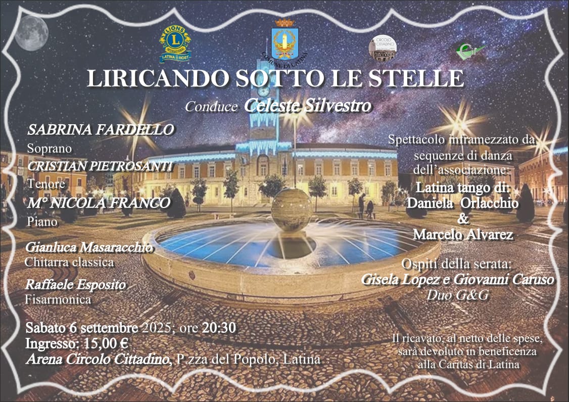 Sabato 6 settembre alle ore 20.30 all’Arena del Circolo Cittadino di Latina in Piazza del Popolo, ritornerà anche quest’anno in scena, l’evento artistico “Liricando sotto le stelle”. A condurre la serata, ideata dalla Direttrice artistica e Soprano Sabrina Fardello,(che si avvarrà del patrocinio del Comune di Latina), sarà ancora una volta la bellissima ed elegante modella Celeste Silvestro. La voce raffinata e intensa della Fardello sarà accompagnata al pianoforte dal Maestro Nicola Franco.
