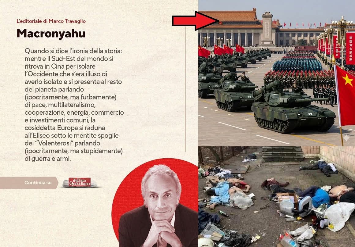 È divertente, non trova? Che mentre il mondo intero assiste attonito alle parate militari cinesi o ai missili russi pioventi su città ucraine, Travaglio riesca a presentarli come