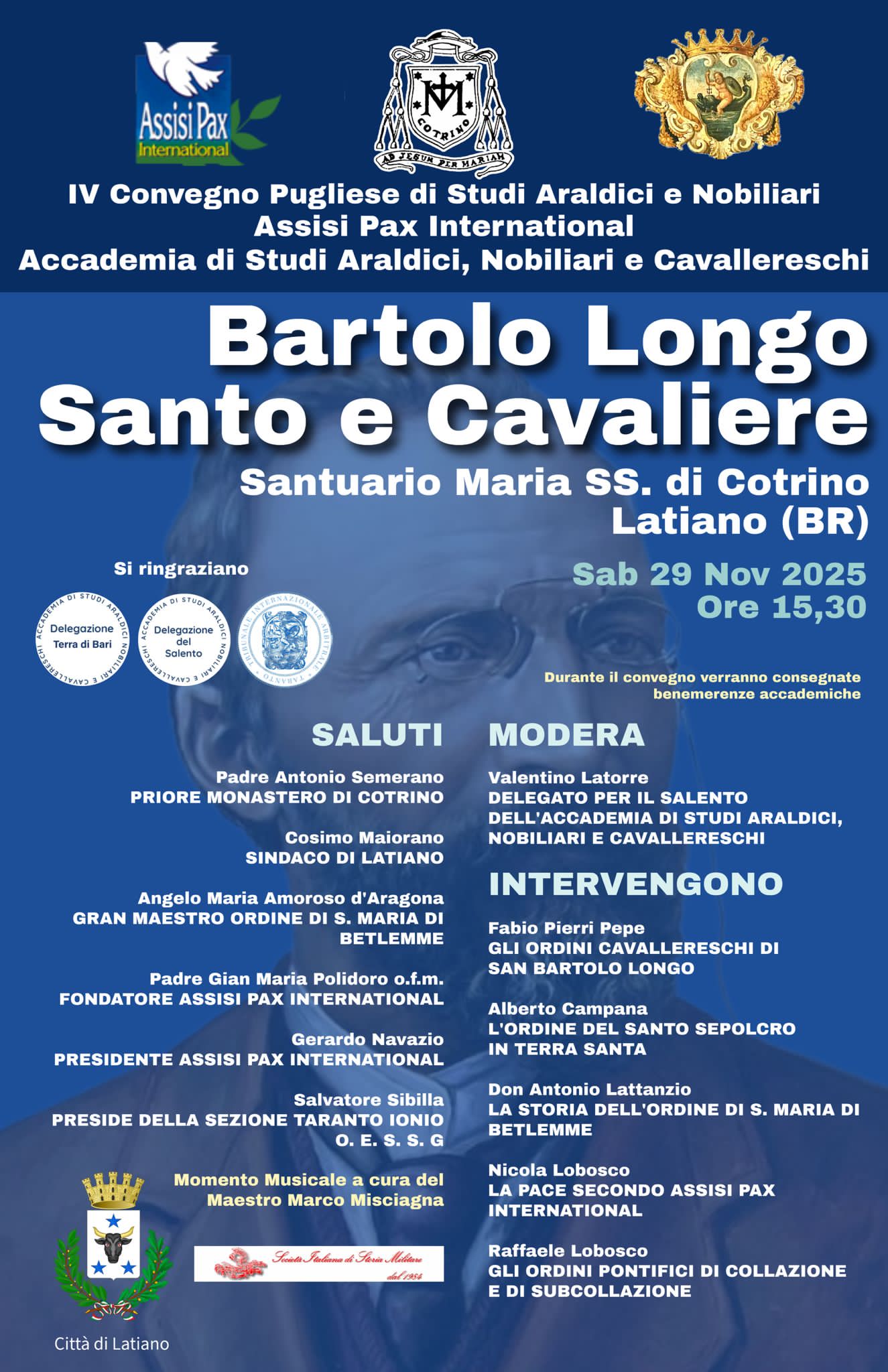 Sabato 29 novembre alle ore 15:30, presso il suggestivo Santuario di Cotrino in Latiano, nel cuore della provincia di Brindisi, si terrà un appuntamento di grande interesse storico e religioso: il convegno dal titolo “Bartolo Longo Santo e Cavaliere”. L’iniziativa, unica nel suo genere, affronterà per la prima volta in modo sistematico e scientifico le onorificenze cavalleresche conferite a Bartolo Longo, il celebre apostolo della carità legato alla rinascita del Santuario di Pompei.