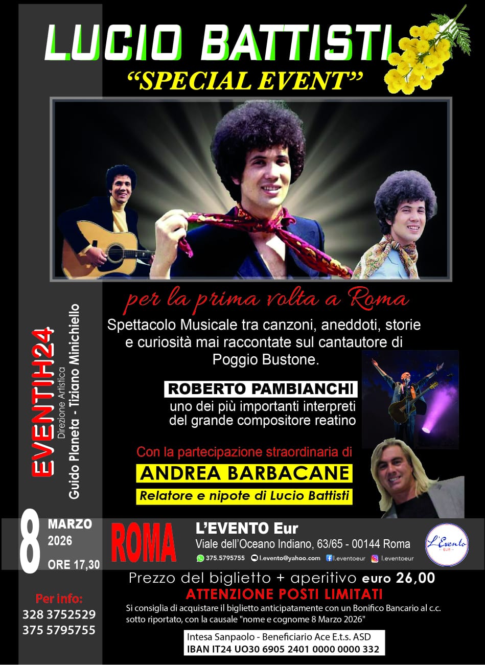 Sarà una serata davvero speciale quella in programma l’8 marzo 2026 a Roma, nella splendida cornice de L’Evento Eur, in via Oceano Indiano 63. Uno spazio elegante e raffinato, capace di coniugare atmosfera accogliente e qualità organizzativa, pronto ad accogliere uno degli appuntamenti più attesi dagli amanti della grande musica italiana. L’esibizione avrà inizio alle ore 17.30 e proporrà al pubblico un viaggio intenso, emozionante e culturalmente ricco nell’universo artistico di Lucio Battisti, il genio di Poggio Bustone che ha rivoluzionato la canzone d’autore italiana. Il costo del biglietto, 26 euro comprensivi di aperitivo, rende l’esperienza ancora più piacevole, unendo spettacolo e convivialità in un contesto curato nei minimi dettagli. A guidare la serata sarà la carismatica Emanuela Petroni, attrice, regista e direttrice artistica di grande esperienza. Con la sua presenza scenica, la sensibilità interpretativa e la capacità di creare un dialogo autentico con il pubblico, saprà impreziosire l’evento, accompagnando gli spettatori in un percorso narrativo coinvolgente e raffinato. Protagonisti sul palco saranno Roberto Pambianchi e Andrea Barbacane, uniti da un progetto artistico che negli ultimi anni ha conquistato pubblico e critica per qualità, rigore e passione. Il loro non è un semplice tributo, ma un omaggio documentato, intenso e profondamente rispettoso all’opera di Battisti. Lo spettacolo, dal titolo evocativo “Quel gran genio di Zio Lucio”, si configura come un vero e proprio racconto in musica ed un intreccio di interpretazioni live, testimonianze familiari, e aneddoti inediti che offrono una prospettiva privilegiata sull’uomo oltre che sull’artista. Andrea Barbacane, nipote del cantautore, con sensibilità e autenticità condivide ricordi personali e storie tramandate in famiglia, restituendo un ritratto intimo e sincero di una delle figure più riservate e influenti del panorama musicale italiano. Il cuore pulsante della serata resta naturalmente la musica. Roberto Pambianchi, noto interprete e frontman dei progetti “Battisti Legend” e “Io e Lucio Battisti”, è considerato una delle voci più credibili e appassionate nell’interpretazione del repertorio battistiano. La sua vocalità calda e potente, rispettosa degli originali ma dotata di una propria cifra emotiva, riesce a far rivivere le atmosfere sonore degli anni Settanta con straordinaria intensità. Accanto a lui, una band composta da musicisti di grande esperienza contribuisce, con professionalità e sensibilità artistica, a ricreare le sonorità che hanno reso immortali album e singoli entrati nella storia della musica italiana. L’approccio musicale non si limita ai grandi successi, ma valorizza anche brani meno noti, offrendo uno sguardo più ampio sul percorso creativo di Battisti, sulle sue sperimentazioni e sulle collaborazioni che ne hanno definito l’identità artistica. È proprio questo equilibrio tra spettacolo e approfondimento a rendere il progetto unico: un’esperienza capace di emozionare e, al tempo stesso, di arricchire culturalmente il pubblico. L’organizzazione è curata da EVENTH24, realtà dinamica e attenta nel panorama degli eventi culturali, con la direzione artistica affidata a Guido Planeta e Tiziano Minichiello. Grazie alla loro visione e competenza, il progetto è stato valorizzato all’interno di un format coerente, elegante e capace di coniugare qualità artistica e coinvolgimento del pubblico. Tra il 2024 e il 2026 lo spettacolo ha già toccato diverse tappe significative, registrando grande partecipazione. A Roma, ad esempio, è stato ospitato anche nella suggestiva cornice di Cinecittà World – Cinecittà Street, mentre altre date, come quella di Isernia, hanno confermato l’interesse trasversale per questa proposta artistica. Ogni appuntamento ha rappresentato un’occasione per rinnovare il legame tra il pubblico e un repertorio che continua a parlare anche alle nuove generazioni, dimostrando quanto la musica di Battisti sia ancora straordinariamente attuale. La scelta di celebrare questo omaggio l’8 marzo aggiunge ulteriore significato alla serata, trasformandola in un evento culturale e musicale capace di unire memoria, emozione e contemporaneità. In un contesto prestigioso come L’Evento Eur, il pubblico potrà vivere un’esperienza immersiva fatta di musica dal vivo, parole e condivisione. Roma si prepara così ad accogliere un appuntamento che promette emozioni autentiche e un’immersione totale nel mondo di Lucio Battisti. L’8 marzo 2026, alle ore 17.30, il palco de L’Evento Eur diventerà il luogo in cui parole e note torneranno a fondersi, rendendo omaggio a quel “gran genio” che continua a vivere attraverso le sue canzoni e grazie alla passione, alla professionalità e alla sensibilità di chi oggi ne custodisce e rinnova l’eredità artistica.